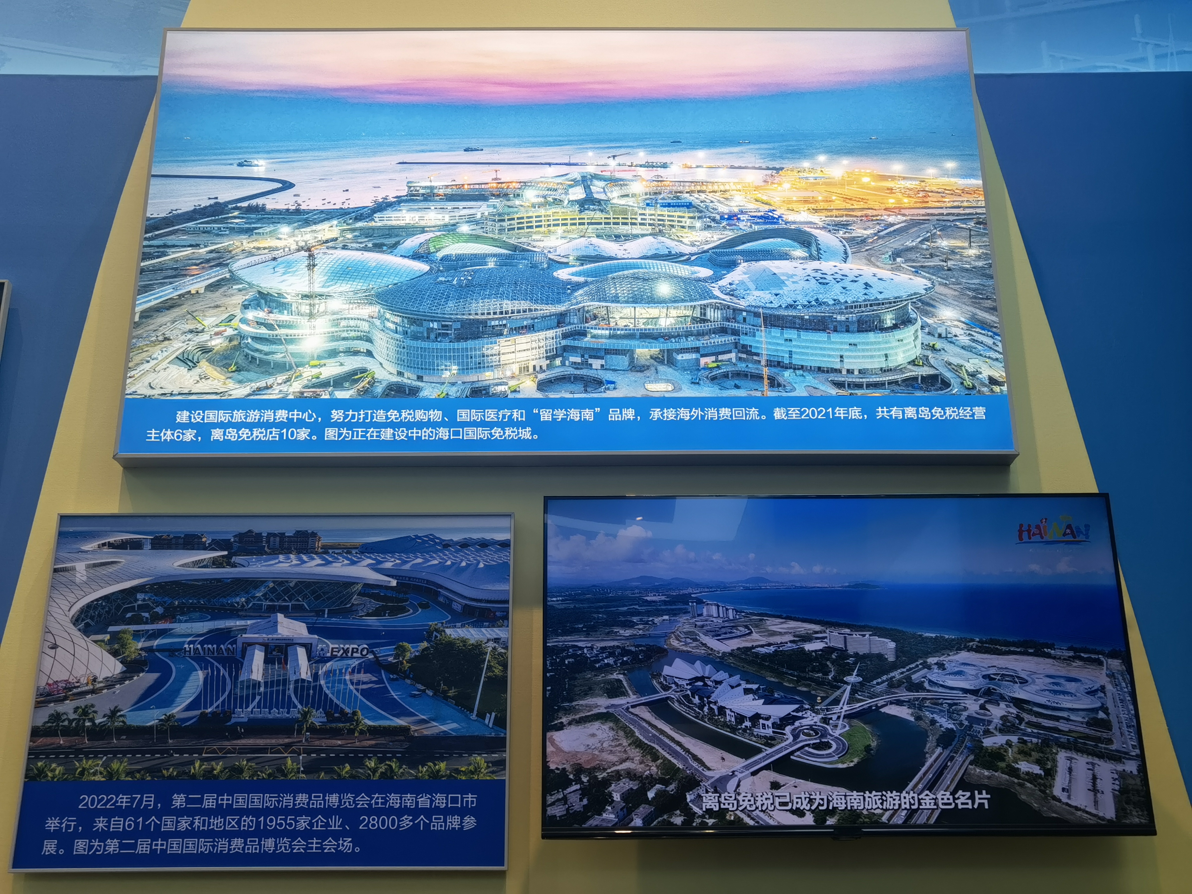 圖為主題成就展地方展區(qū)(海南)展示正在建設(shè)中的海口國際免稅城