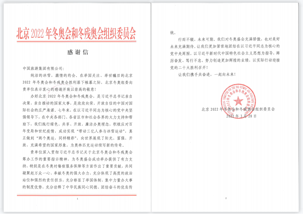 3月28日,北京2022年冬奧會(huì)和冬殘奧會(huì)組織委員會(huì)向集團(tuán)發(fā)來感謝信,對集團(tuán)表示衷心感謝并致以崇高的敬意。