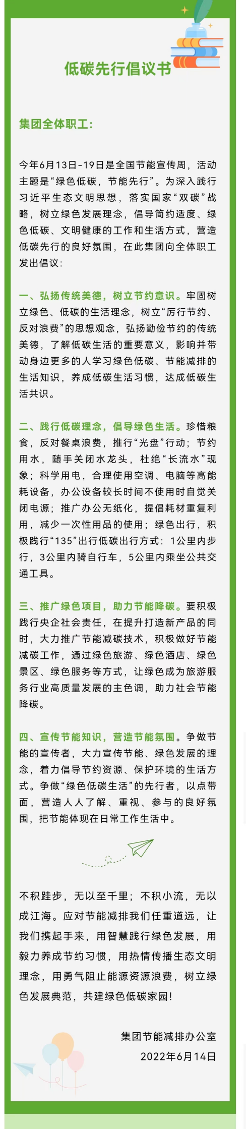 實現(xiàn)碳達峰、碳中和,是黨中央經(jīng)過深思熟慮作出的重大戰(zhàn)略決策,是對國際社會的莊嚴承諾,也是推動高質量發(fā)展的內(nèi)在要求。集團深入貫徹習近平生態(tài)文明思想,落實國家“雙碳”戰(zhàn)略,樹立綠色發(fā)展理念,倡導簡約適度、綠色低碳、文明健康的工作和生活方式,營造低碳先行的良好氛圍。倡議書向全體職工倡議,要弘揚傳統(tǒng)美德,樹立節(jié)約意識;踐行低碳理念,倡導綠色生活;推廣綠色項目,助力節(jié)能降碳;宣傳節(jié)能知識,營造節(jié)能氛圍。倡議書號召全體職工攜起手來,用智慧踐行綠色發(fā)展,用毅力養(yǎng)成節(jié)約習慣,用熱情傳播生態(tài)文明理念,用勇氣阻止能源資源浪費,樹立綠色發(fā)展典范,共建綠色低碳家園。(集團運營管理部/環(huán)境健康與安全監(jiān)管部)