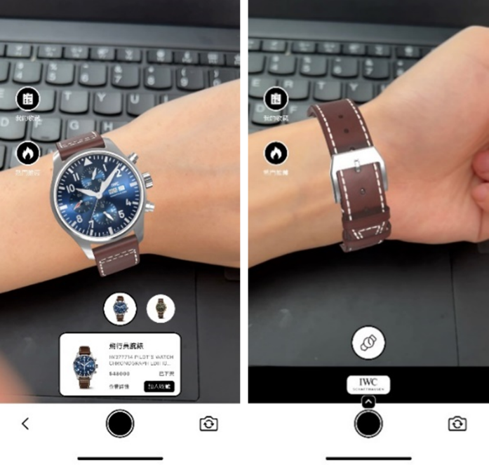 為了滿足來(lái)自世界各地的旅客需求,新增工具適用于不同的應(yīng)用平臺(tái)。除了試妝,新增的工具也可試戴手表,專為客戶行前計(jì)劃打造的,手表以AR效果呈現(xiàn)在手腕上,客戶可以仔細(xì)瀏覽手表細(xì)節(jié),如果客戶喜歡手表,可以加入購(gòu)物車并提前預(yù)定,再于抵達(dá)時(shí)到店內(nèi)查看。
